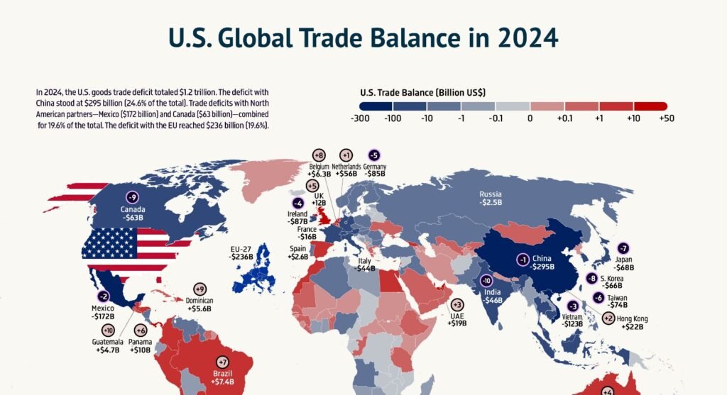 Aux États-Unis, le schéma est similaire. En 2024, le commerce de biens entre les deux puissances a totalisé ~ 659 milliards USD. (United States Trade Representative) Même si Washington tente de diversifier ses fournisseurs, l’écart persiste : la Chine reste un pilier de l’approvisionnement américain.