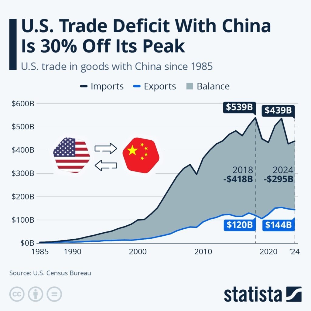 - Malgré les tensions tarifaires et la guerre commerciale relancée, le déficit commercial américain vis-à-vis de la Chine persiste. En 2024, les États-Unis ont importé pour 438,7 milliards de dollars de biens chinois et exporté pour 143,2 milliards de dollars vers la Chine, ce qui représente un déficit d’environ 295,5 milliards de dollars. (United States Trade Representative)