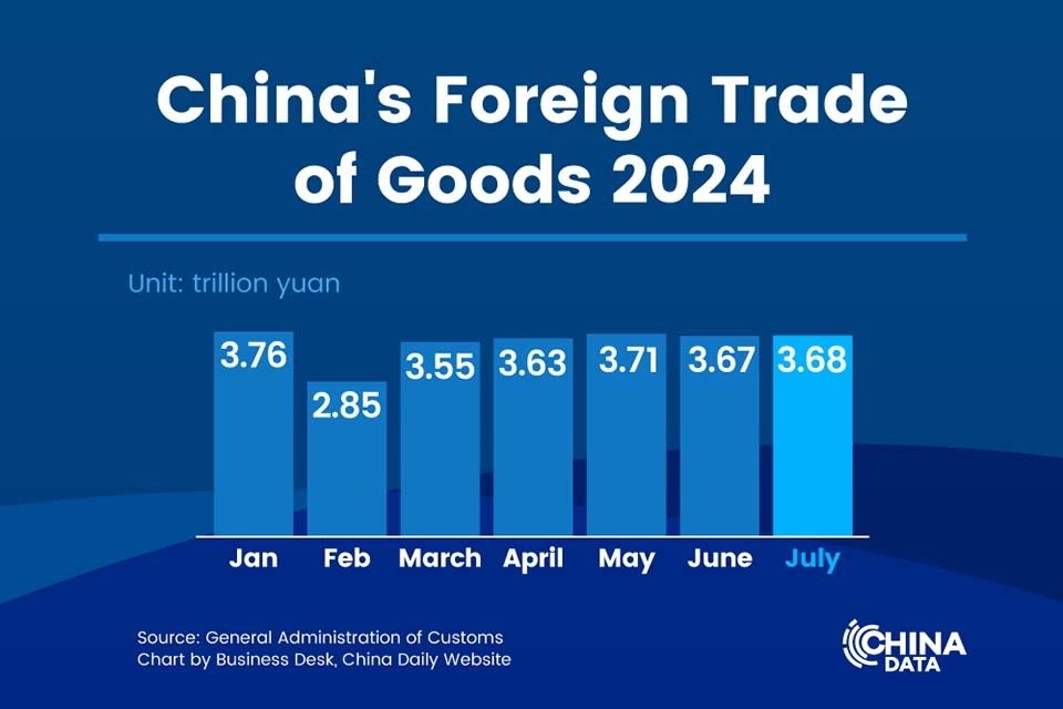 - Dans le détail, les exportations ont progressé de 7,1 % pour atteindre 25,45 trillions de yuans, tandis que les importations ont augmenté de 2,3 %, à 18,39 trillions de yuans. (Gouvernement Chinois)